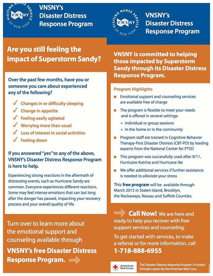 - VNSNY Disaster Distress Response Program (PDF) - Offers emotional support and free counseling services to those affected by Superstorm Sandy. For more information, please call 1-718-888-6955.