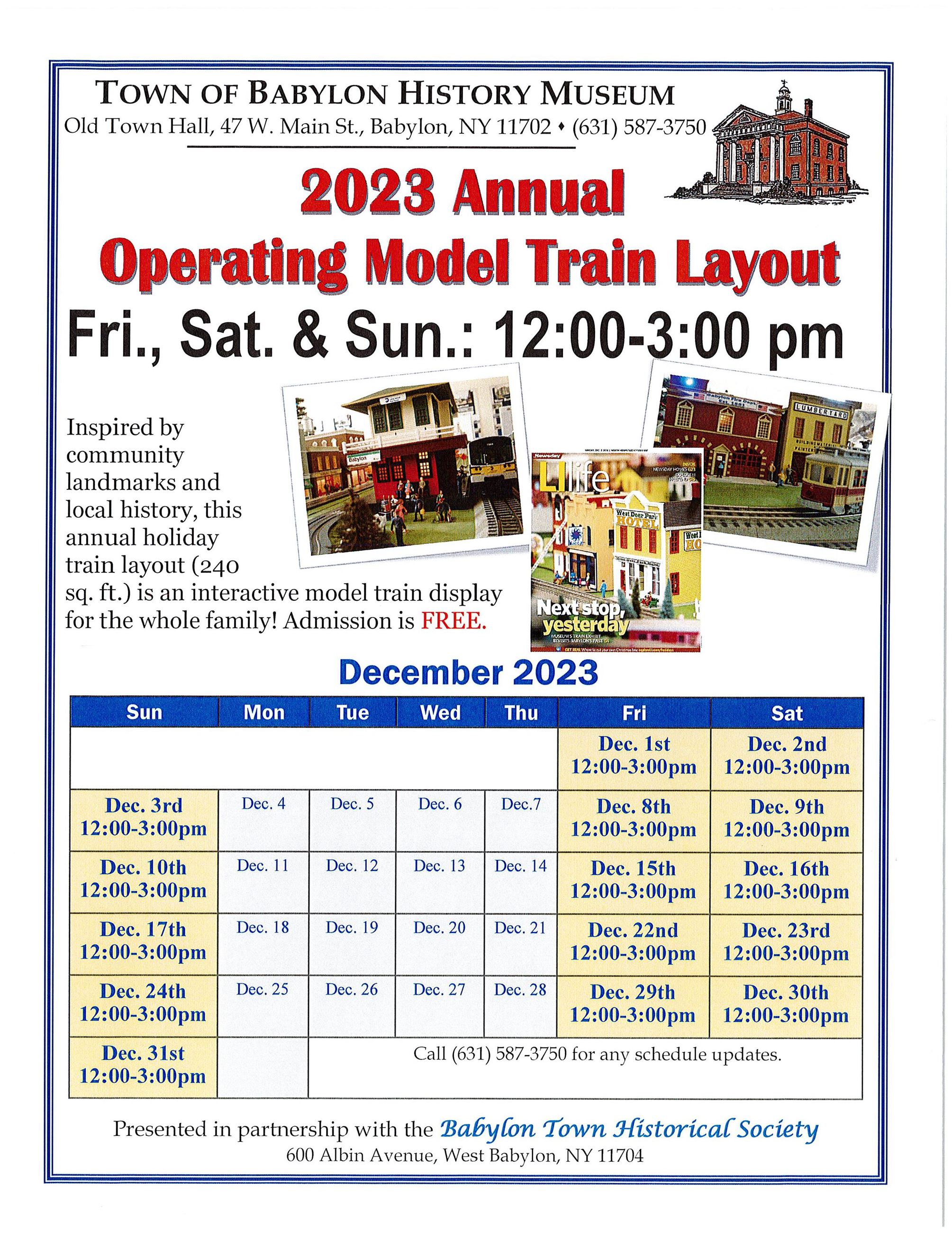 The Town of Babylon History Museum at Old Town Hall is excited to announce the 2023 Annual Operating Model Train Layout schedule for December 2023. Inspired by community landmarks in the Town of Babylon and local history, this annual holiday train layout (240 sq. ft.) is an interactive model train display for the whole family! Admission is FREE. Old Town Hall is located at 47 W. Main Street, Babylon, NY 11702.